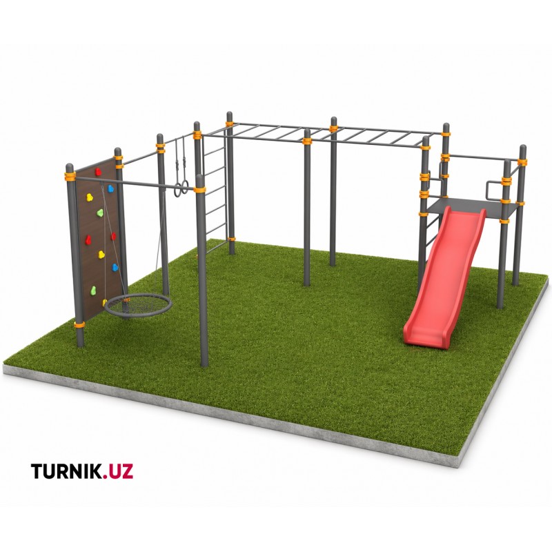 Конструкция выполнена из прочной стали с износостойким порошковым покрытием, устойчивым к погодным условиям Узбекистана. Элементы, с которыми взаимодействуют дети, продуманы с точки зрения безопасности и удобства. Скалодром и дополнительные элементы создают полноценную игровую зону, а горка добавляет динамику и интерес.