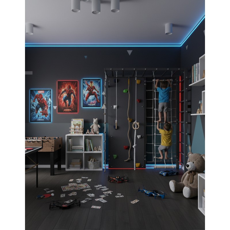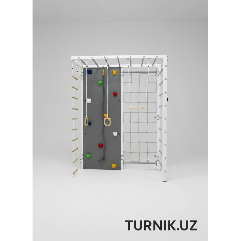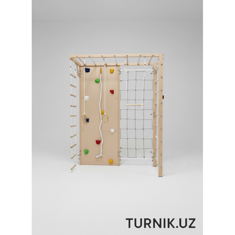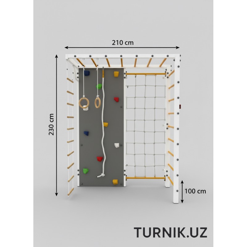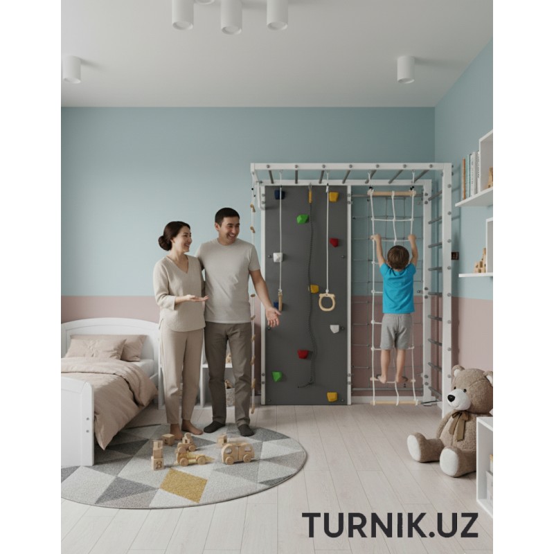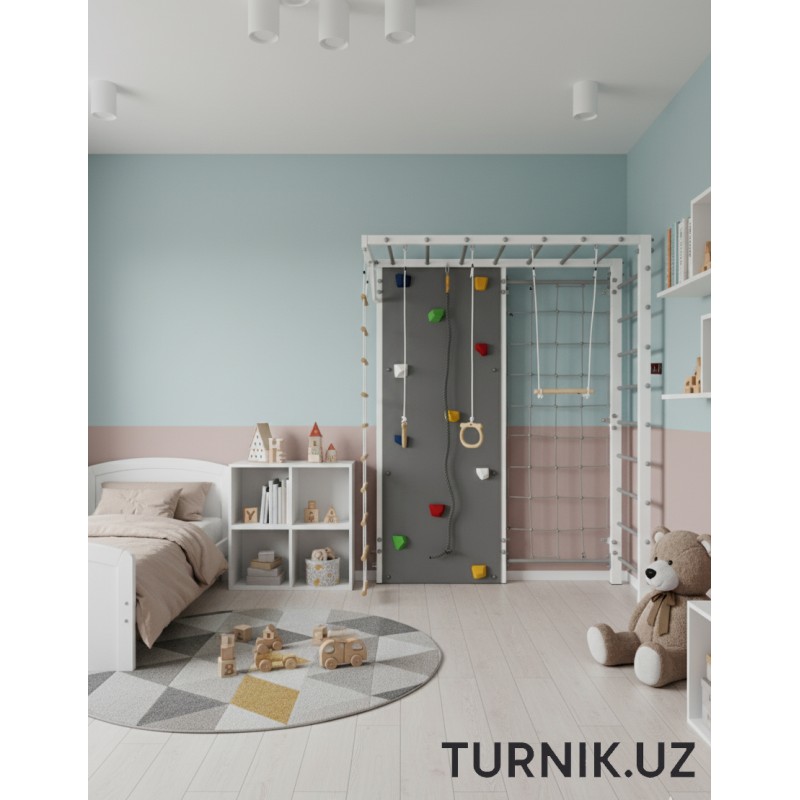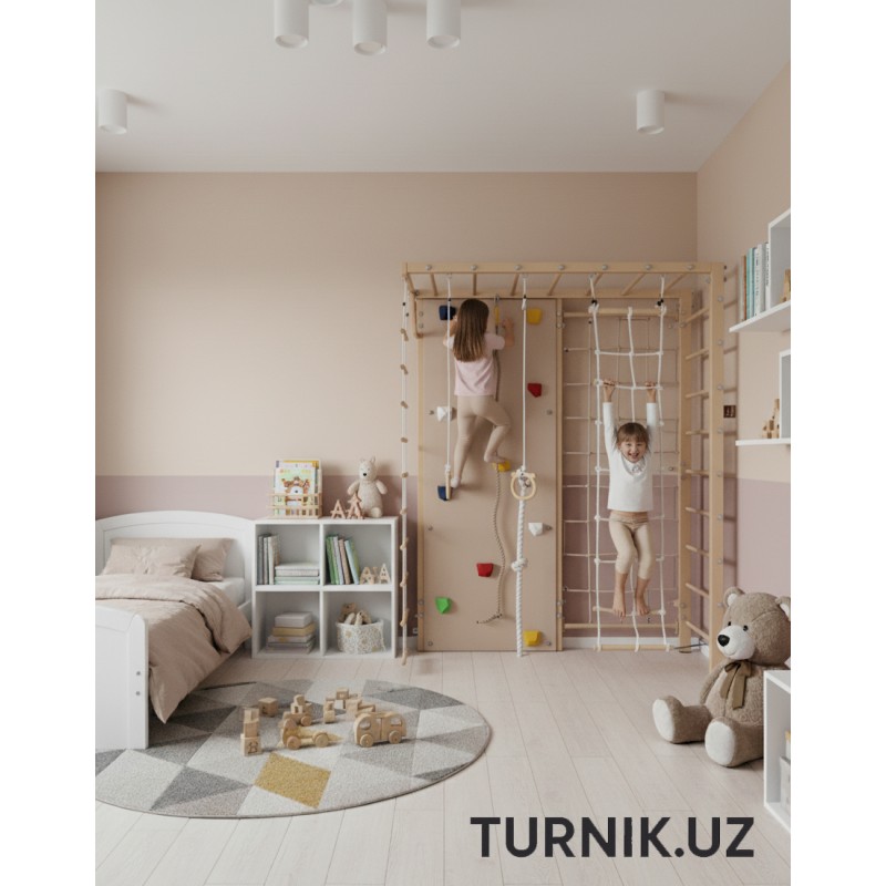 Комплекс объединяет все необходимое для гармоничного развития ребенка: шведская стенка, рукоход, веревочная сетка, скалодром, канат и кольца. Установка в углу обеспечивает дополнительную устойчивость и безопасность, а прочный металлический каркас выдерживает до 150 кг, что позволяет заниматься даже подросткам и взрослым.