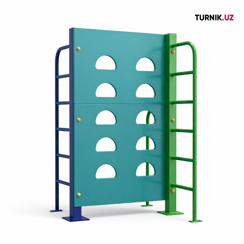 Конструкция представляет собой вертикальную стенку с отверстиями и боковыми лестницами, позволяющими детям подниматься, перелезать и спускаться.