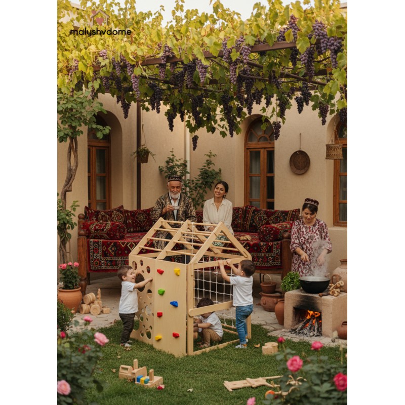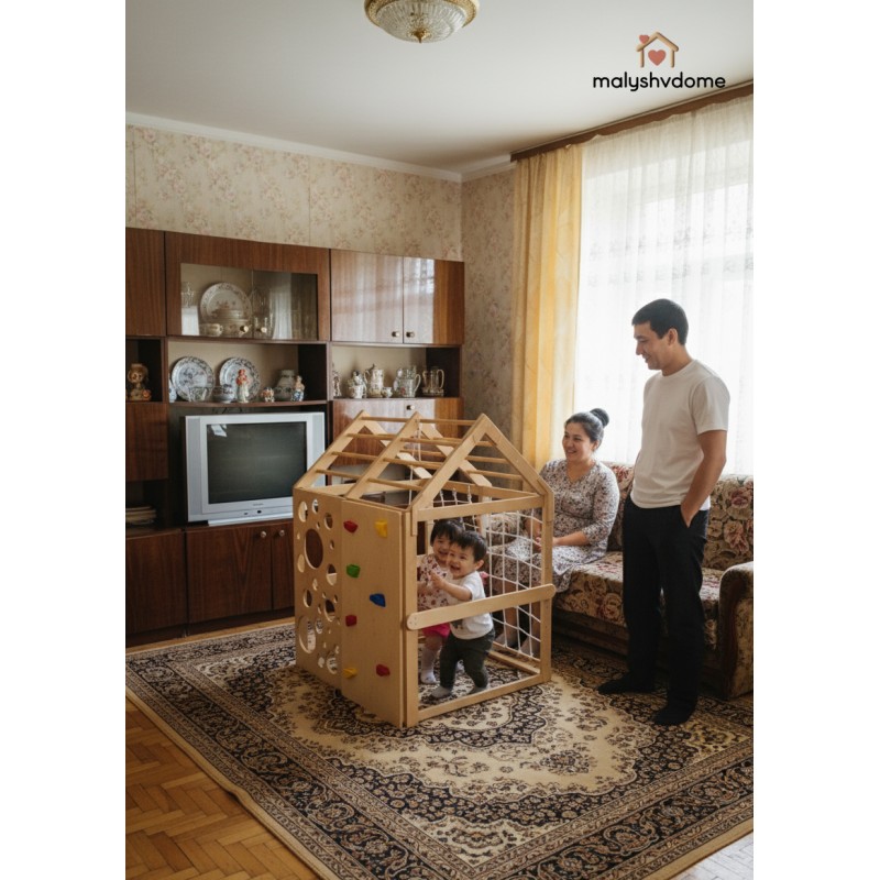 Представляем увеличенный игровой комплекс "Домик" — полноценный домашний спортзал, созданный для гармоничного физического развития вашего ребенка. Благодаря внушительной высоте 190 см и основанию 140х140 см, этот комплекс дарит максимальную свободу движений, оставаясь при этом компактным и безопасным элементом интерьера.