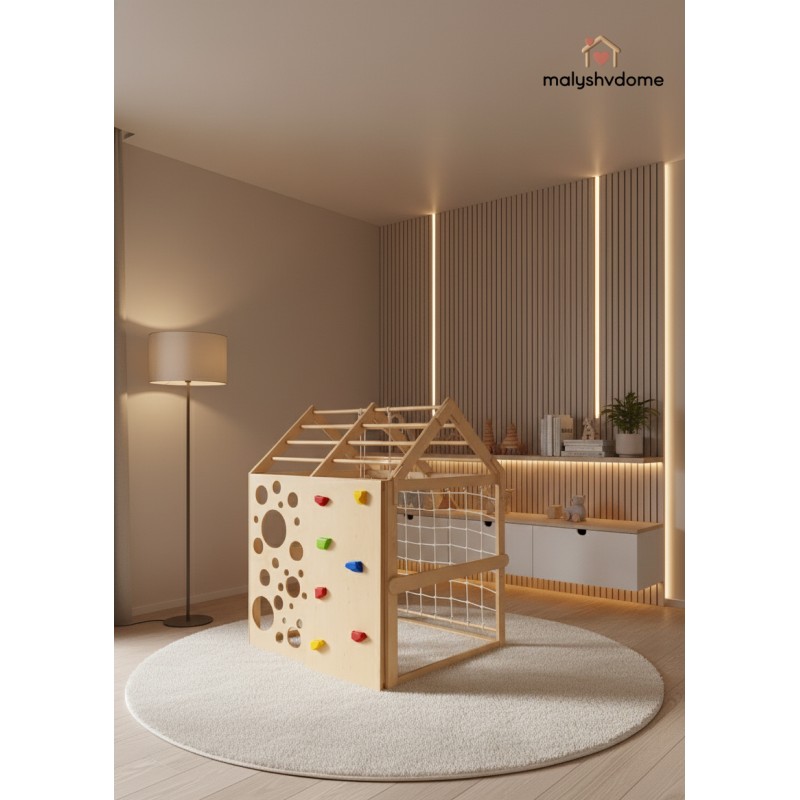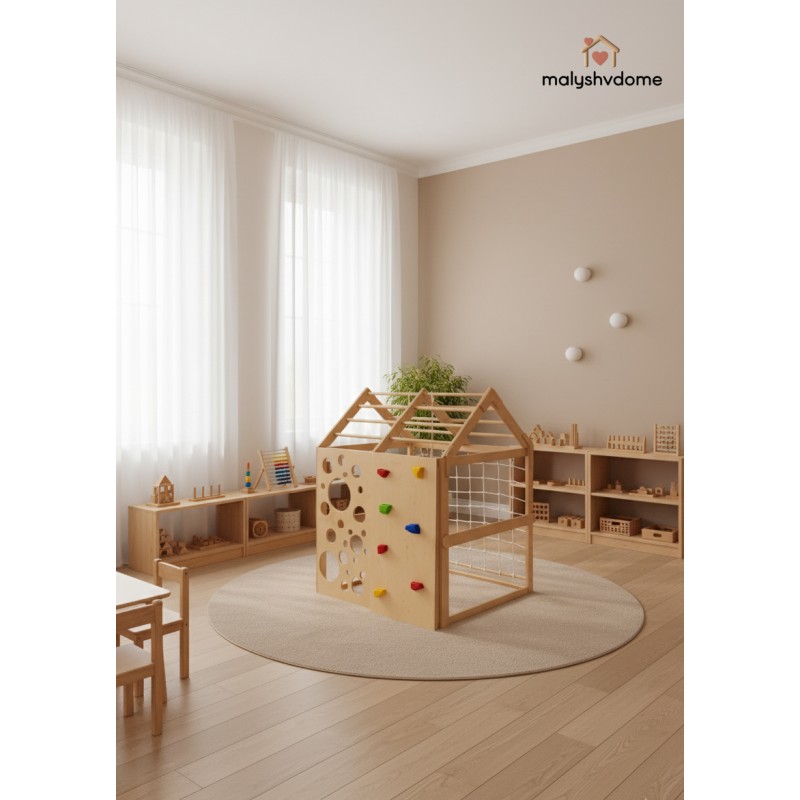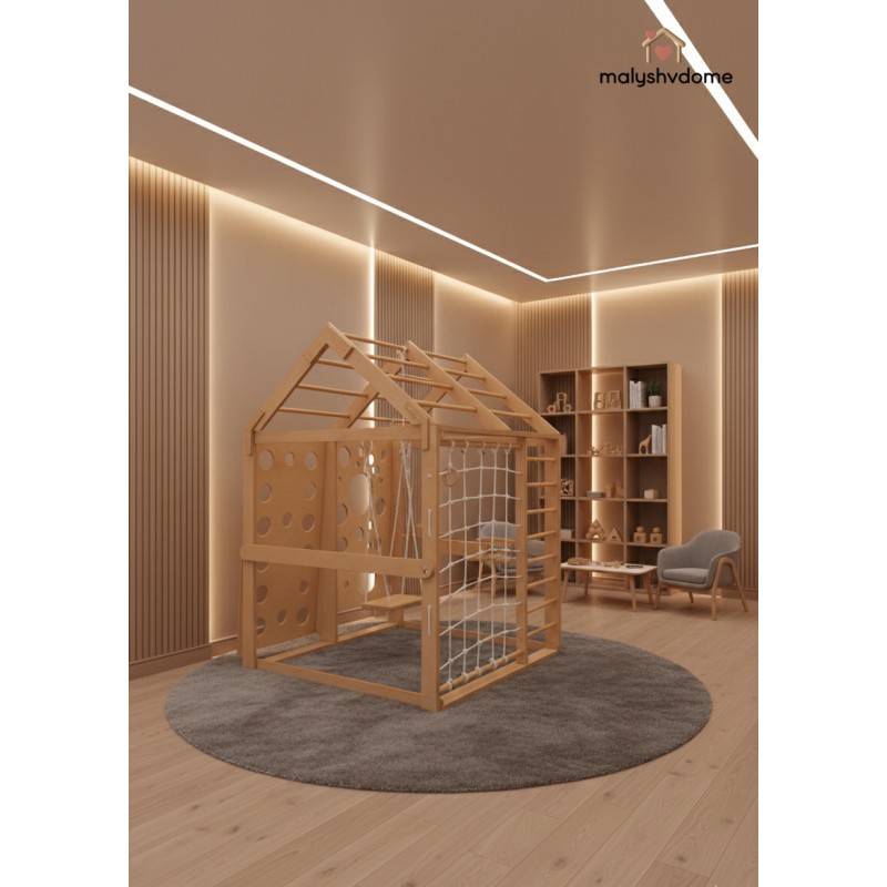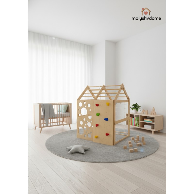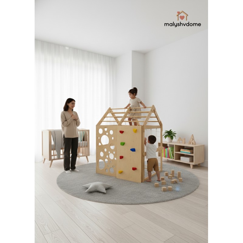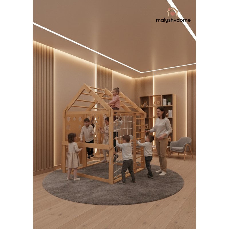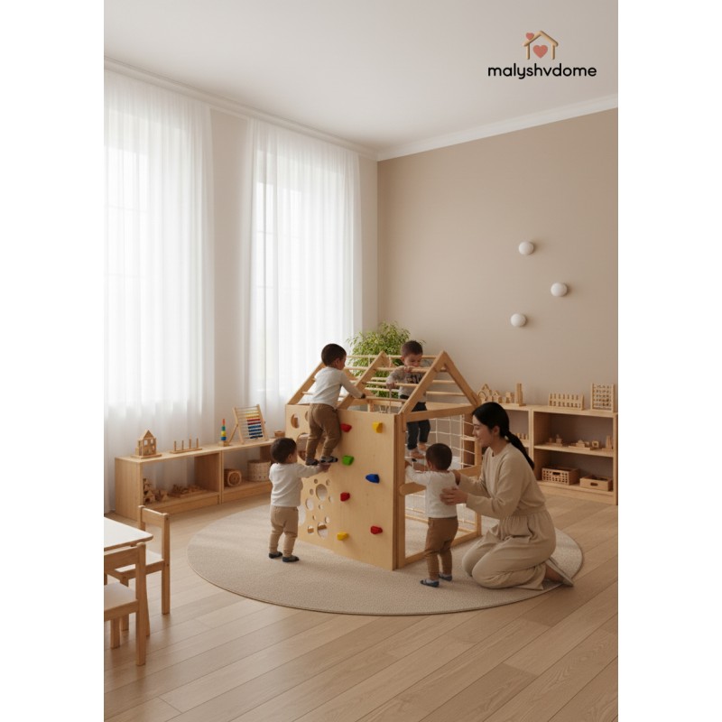 Комплекс "Домик" спроектирован в соответствии с принципами Монтессори-педагогики и скандинавского дизайна. Он выглядит стильно и органично, легко вписываясь в современные интерьеры.