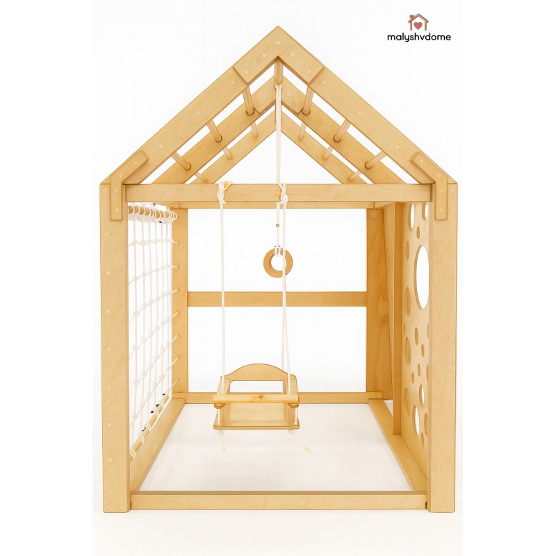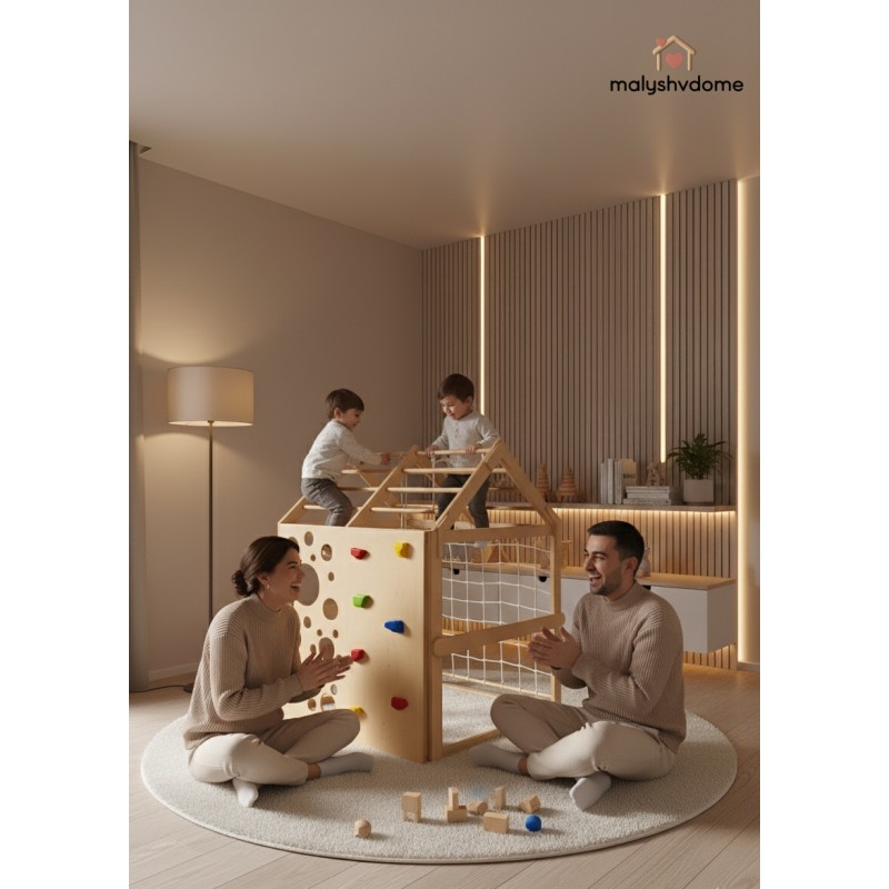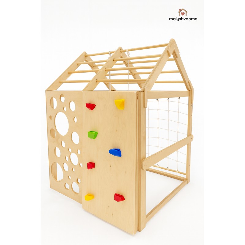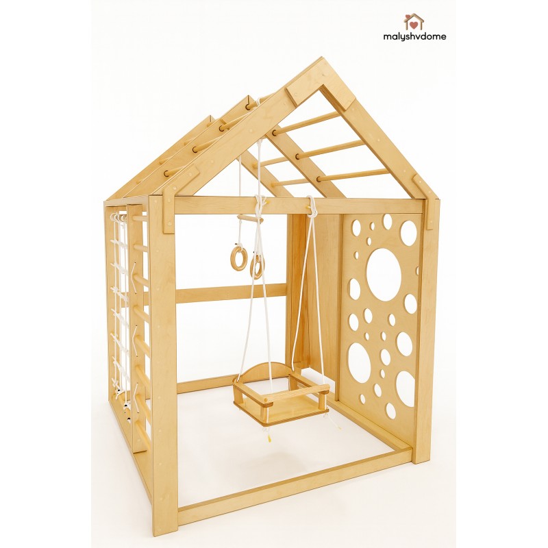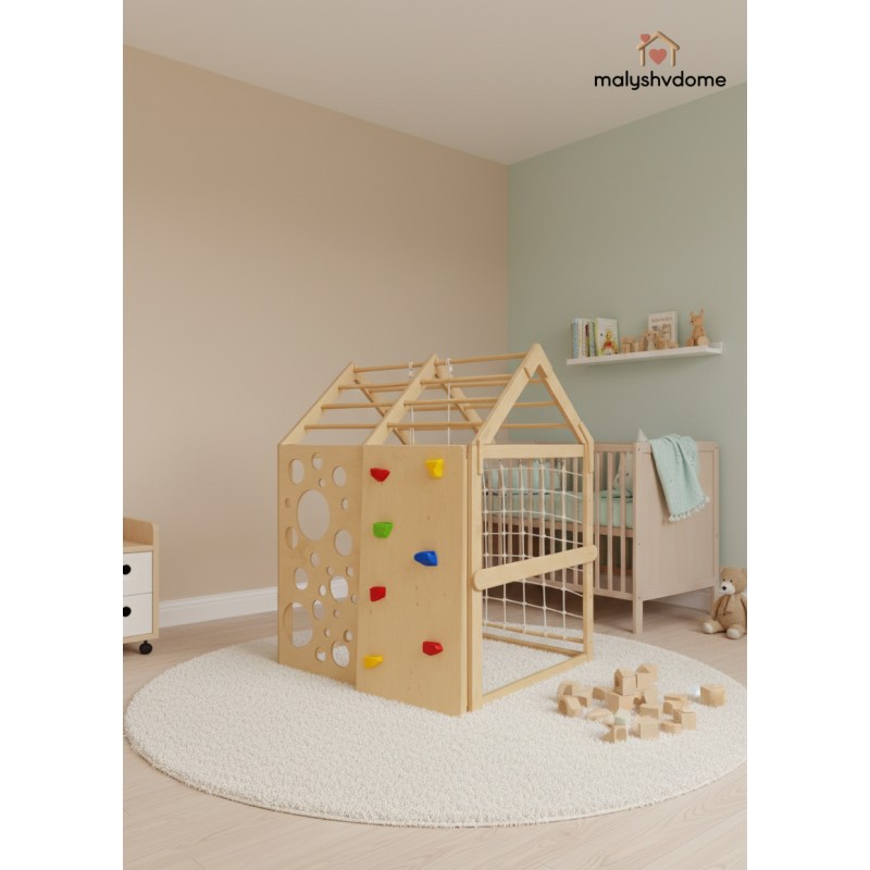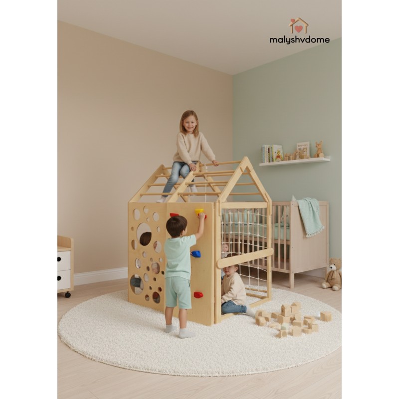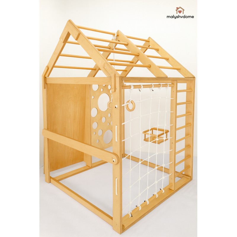 Комплекс "Домик" спроектирован в соответствии с принципами Монтессори-педагогики и скандинавского дизайна. Он выглядит стильно и органично, легко вписываясь в современные интерьеры.