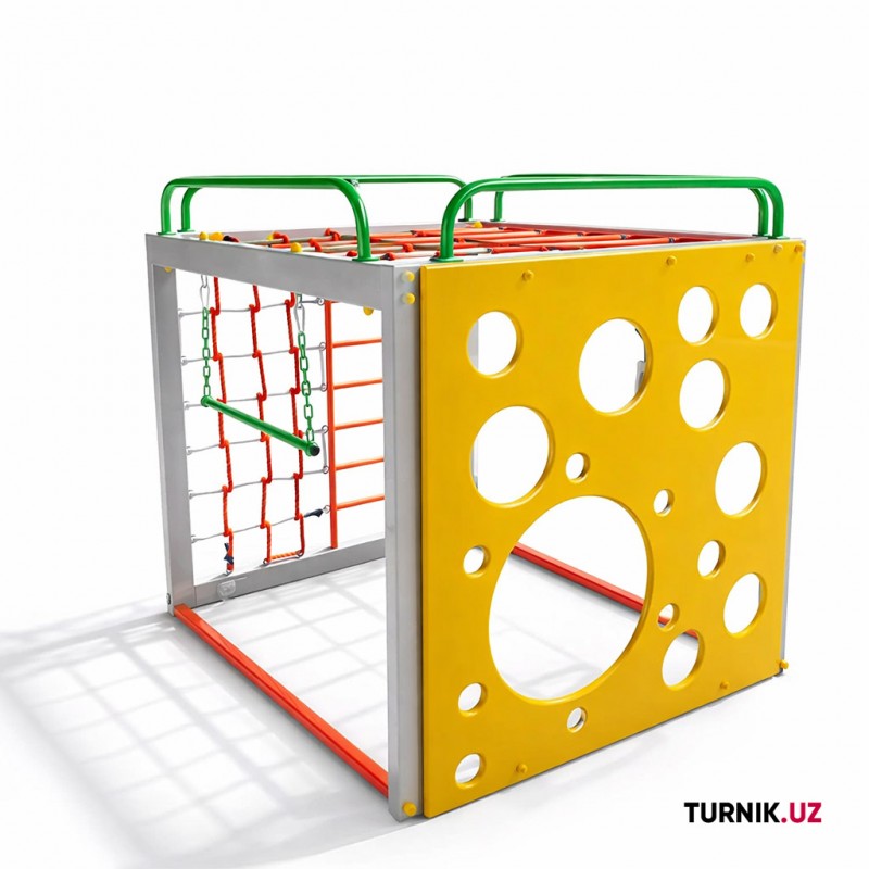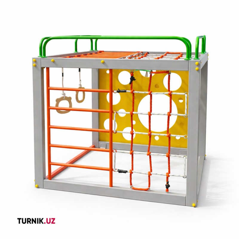 КомплектацияКаркас-куб, фанерная панель с отверстиями, веревочная сетка-гамак, деревянные качели (возможна замена на кольца)