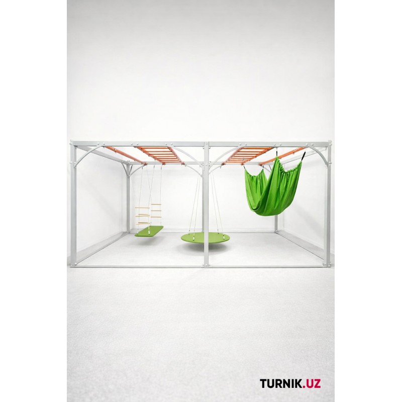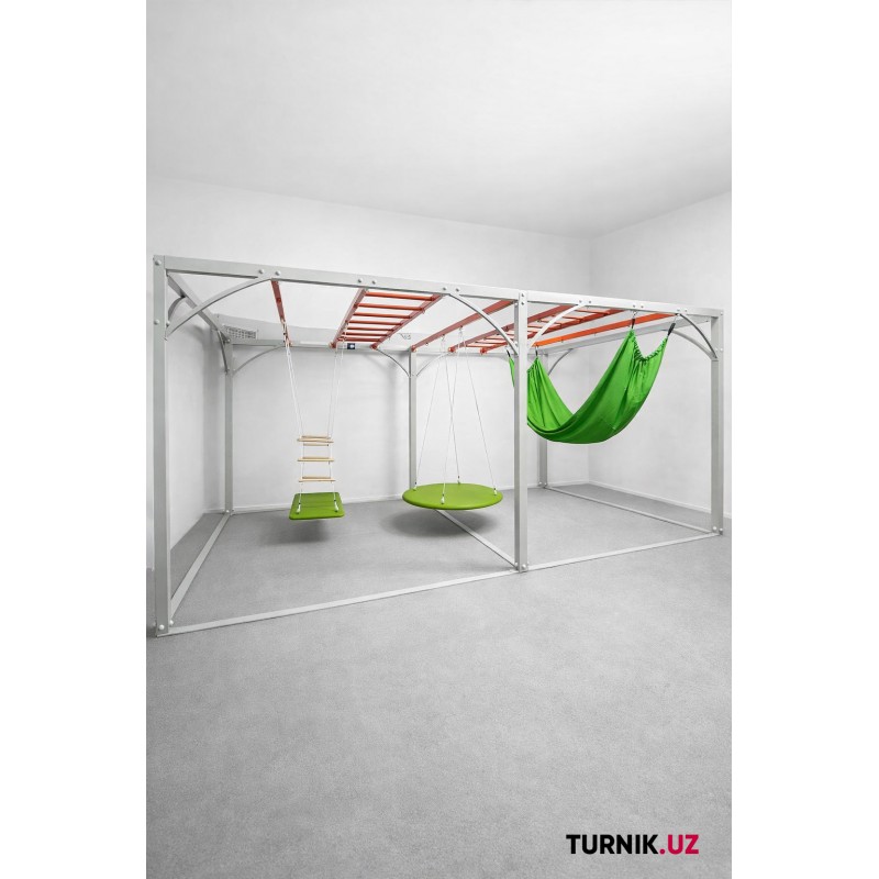 Конструкция совместима с различными подвесными снарядами: гамаками, качелями, платформами, лестницами и другими элементами (приобретаются отдельно). Подходит для занятий, направленных на развитие моторики, координации и вестибулярной стимуляции.