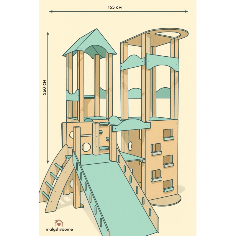 "Башня" разработана для детей до 7 лет (дошкольников), учитывая все особенности их физического и когнитивного развития. С внушительной высотой 260 см и устойчивым основанием 160x160 см комплекс обеспечивает впечатляющий простор для игр, оставаясь при этом абсолютно безопасным и надежным.