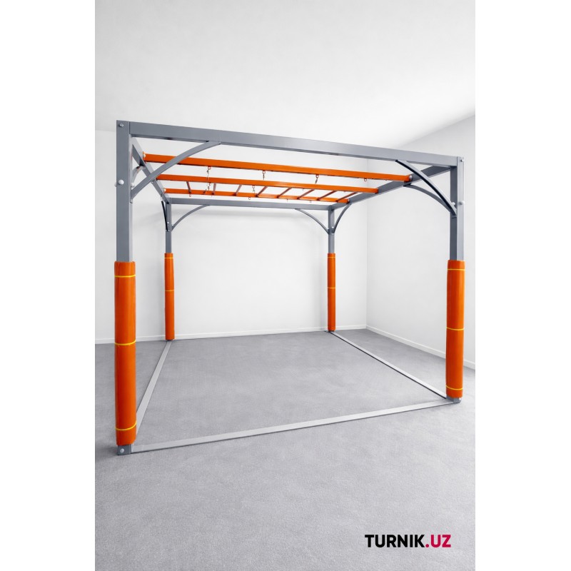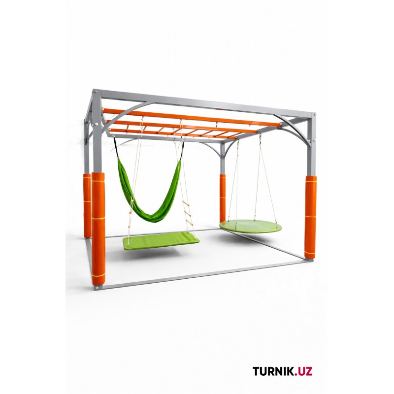 Конструкция совместима с различными подвесными снарядами: гамаками, качелями, платформами, лестницами и другими элементами (приобретаются отдельно). Подходит для занятий, направленных на развитие моторики, координации и вестибулярной стимуляции.